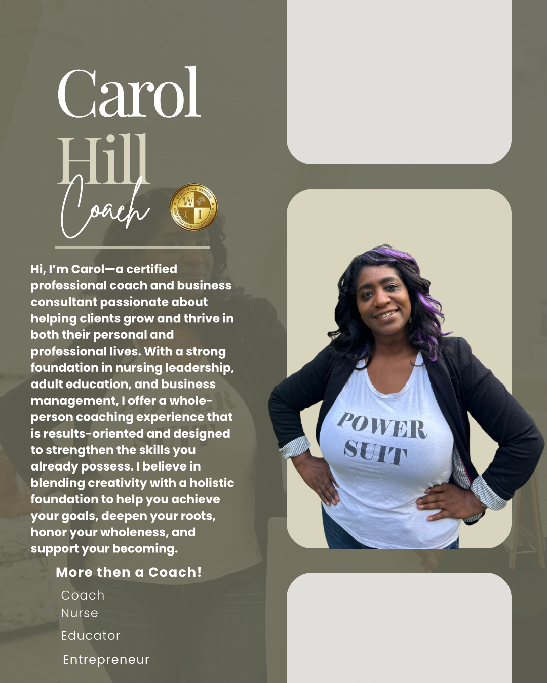 Hi! I’m Carol Hill, Founder and Senior Coach and Healthcare Advocate here at LeadWhole Coaching & Healthcare Advocacy located in beautiful Central New York. I am a Certified Professional Coach that specializes in lifestyle & leadership development coaching, with a special focus in workplace trauma recovery. I am a registered nurse of more than 28 years and have been in the healthcare industry for more than 30 years. I hold a bachelor’s degree in Human & Community Services and a Masters in Healthcare Administration (MHA). I am a business owner as well as a business consultant, primarily in the areas of healthcare and human services. I offer both individual and group coaching sessions to my clients as well as offering a wide range of educational programming for individuals and businesses alike.
